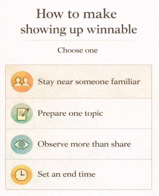 Showing up to a social event isn’t half the battle.